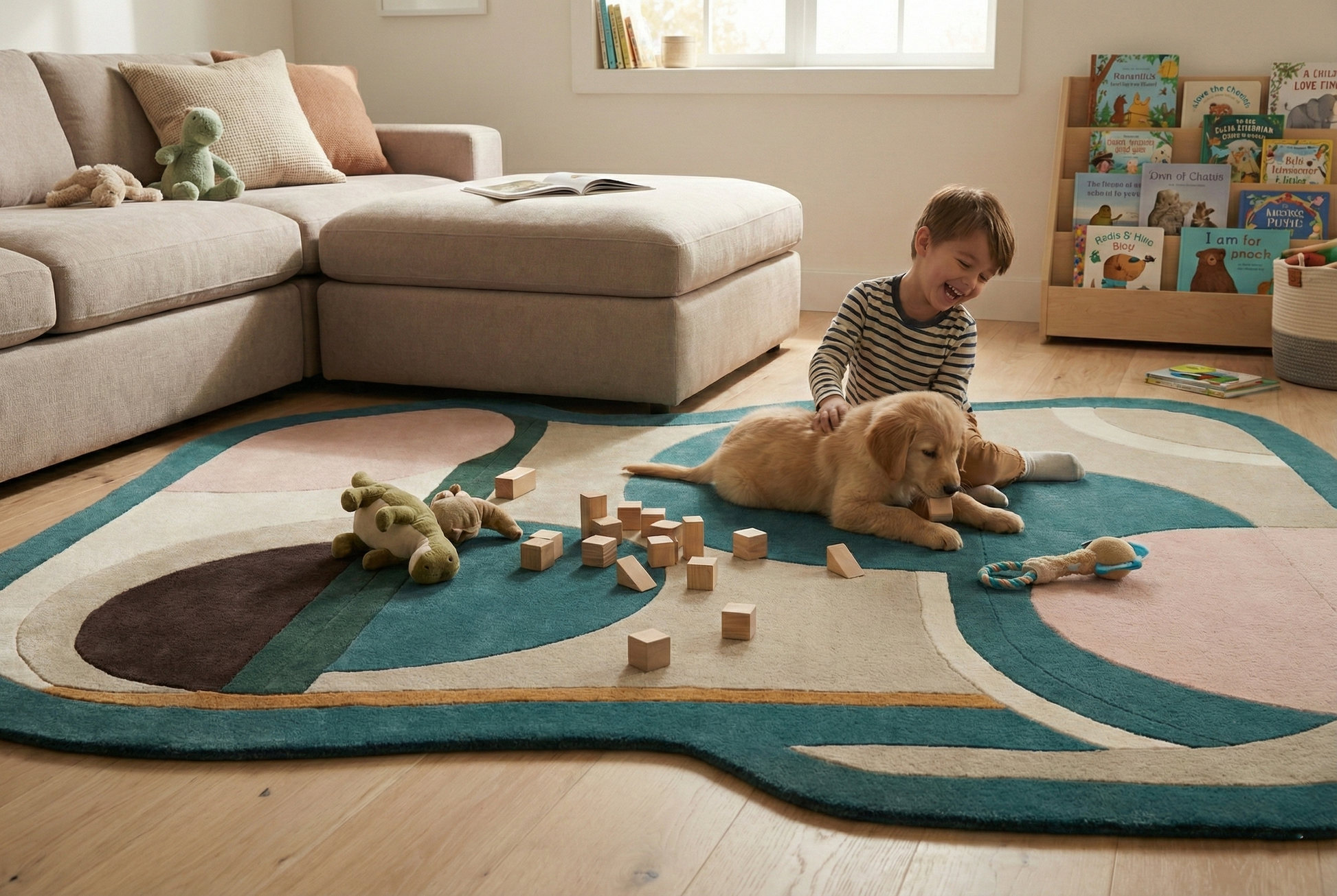 This rug blends soft textures with visually rich color blocks, making it ideal for living rooms, lounges, reading corners, and designer spaces. The free-form shape adds character while maintaining harmony with modern furniture layouts.